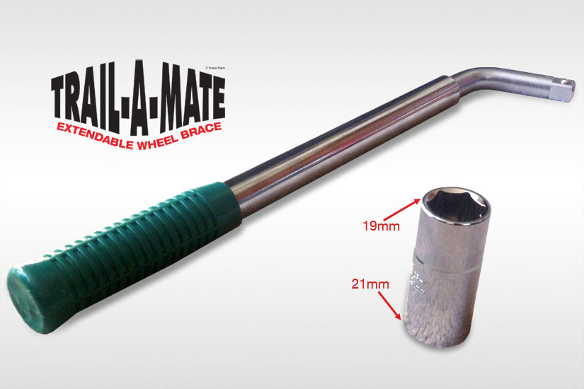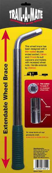 This wheel brace has been designed with a thin walled double ended socket (19mm and 21mm) to suit caravans and trailers with recessed wheel nuts. Handle extends by 200mm.